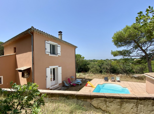 Maison contemporaine offrant de beaux volumes, et un espace extérieur aménagé avec piscine et pool house (face à la terrasse et la cuisine).