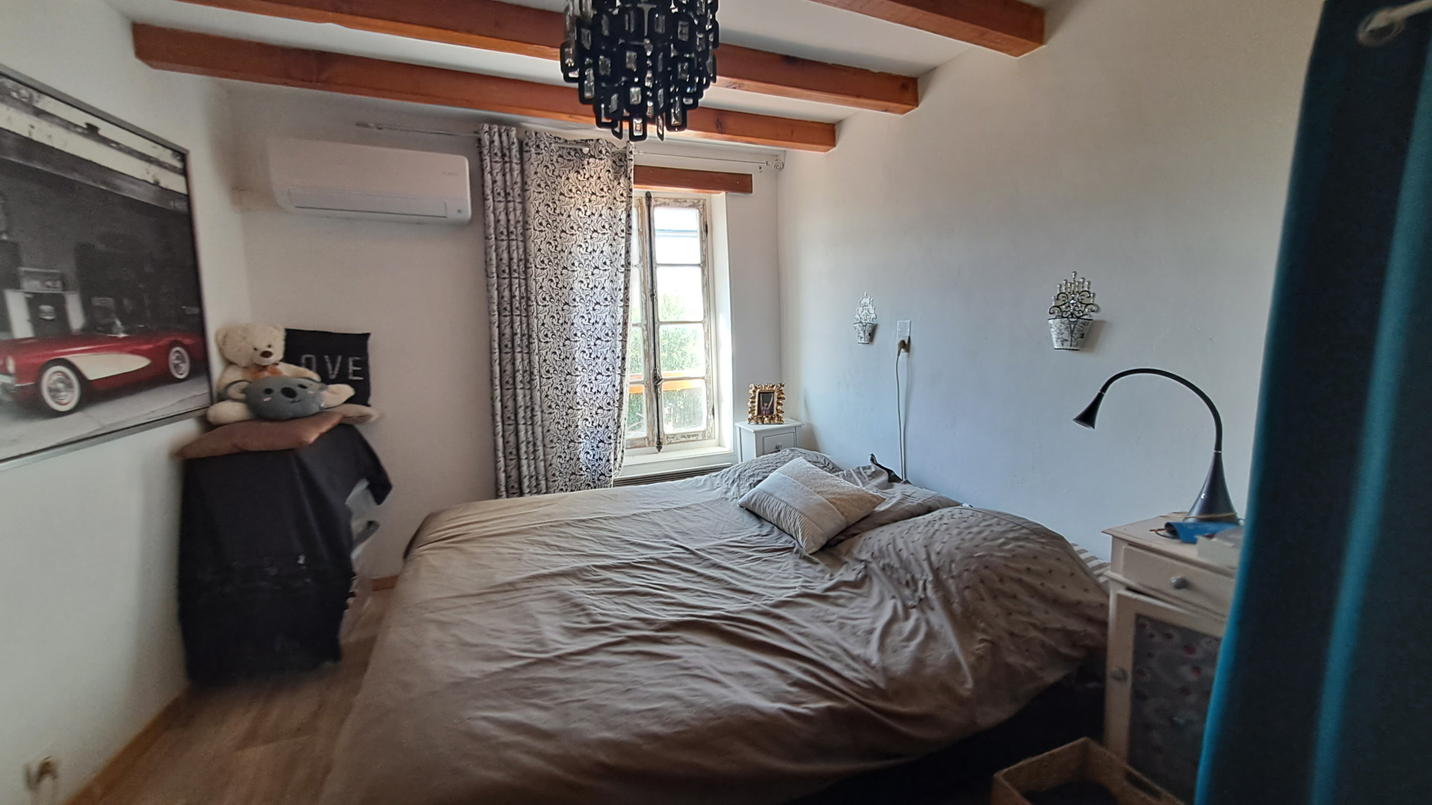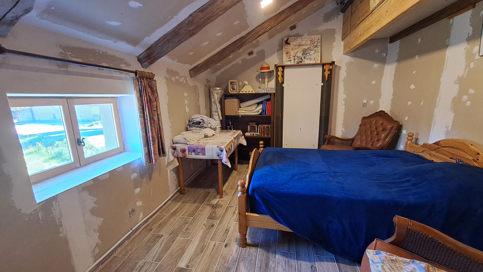 À l’étage, trois chambres vous attendent, dont une suite parentale avec poutres apparentes, véritable cocon plein de charme. (Quelques finitions de peinture à prévoir pour en révéler tout le potentiel.)