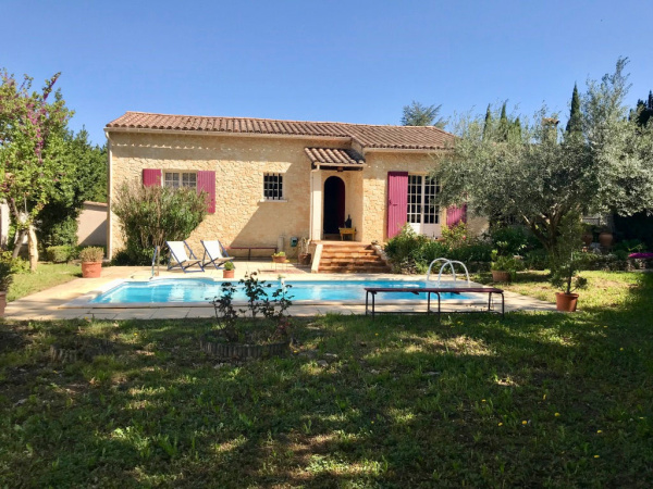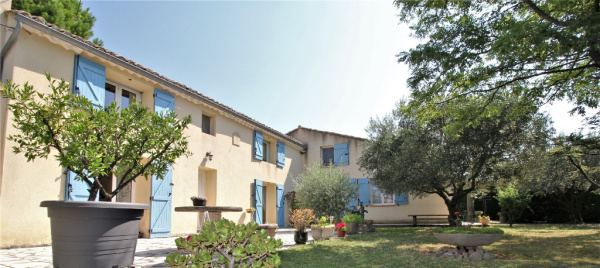Sérignan du Comtat - Dans un environnement privilégié et à proximité du centre du village, jolie maison de plain pied de 120 m² sur un terrain en partie clos et arboré de 4000 m² environ, avec piscine et double garage attenant à la maison.